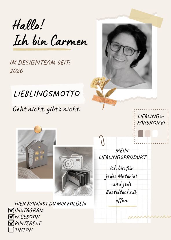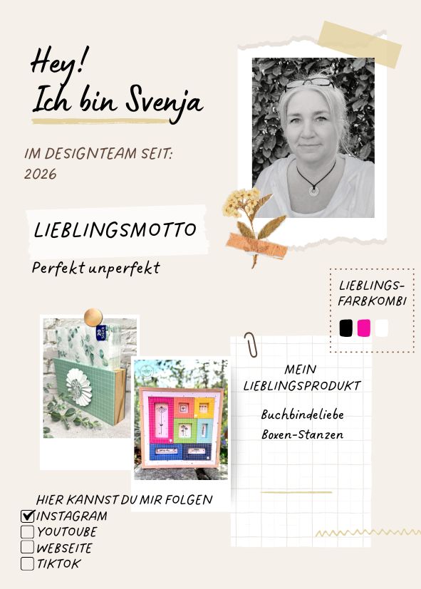 Auf ihrem Instagram-Profil zeigt sie regelmäßig inspirierende Ideen für Karten, Layouts, Minialben und vieles mehr – mit Liebe zum Detail, raffinierten Techniken und sogar Nadel und Faden im Einsatz.